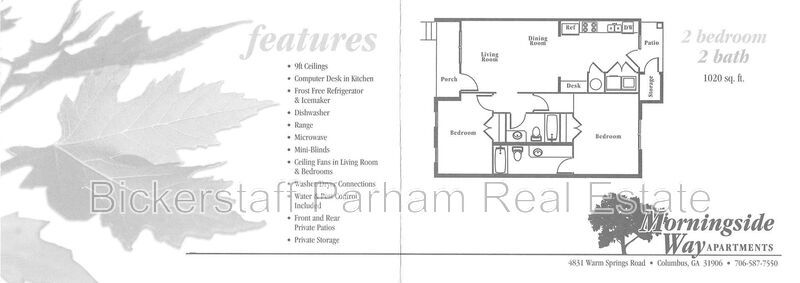 Experience the comfort and convenience of living in Columbus, GA with our Spring Special at Morningside! This 2-bedroom, 2-bathroom upstairs unit offers a spacious 1020 sq. feet of living space, complete with 9ft ceilings and ceiling fans in both the living and bedrooms. The kitchen is a dream for any home cook, equipped with a range stove, fridge with ice maker, dishwasher, microwave, and even a built-in computer desk. The apartment is total electric, ensuring energy efficiency. Each room is fitted with mini blinds for privacy, and the front and rear private patios provide a perfect spot for relaxation. The unit also comes with private storage and washer and dryer connections for your convenience. Please note that this is a no-pets property. Apply today and make Morningside your new home!